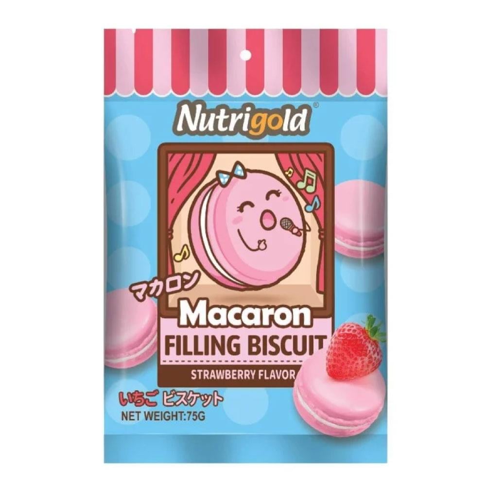 NUTRIGOLD Macaron Filling Biscuit Strawberry Flavor 75g. Rich taste, crips on the outside, soft on the inside, colourful in appearance, exquisite and small.